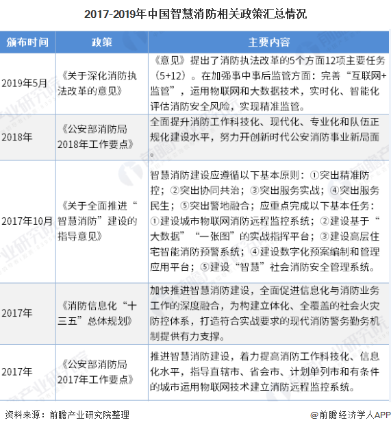 智能消防是一個(gè)巨大的市場(chǎng),是未來消防行業(yè)發(fā)展的必然趨勢(shì)。 2017年10月,公安部消防局發(fā)布的《關(guān)于全面推進(jìn)“智慧消防”建設(shè)的指導(dǎo)意見》,提出了智能消防的重點(diǎn)建設(shè)任務(wù)和工作目標(biāo)?!断佬畔⒒?quot;十三五"總體規(guī)劃》指出,要加強(qiáng)消防信息化建設(shè),以提高消防管理和滅火救援信息的搜集、處理、傳輸、共享能力,提高消防信息的綜合利用率,為消防部隊(duì)的快速反應(yīng)、協(xié)同作戰(zhàn)、指揮決策提供強(qiáng)有力的技術(shù)支撐。2019年5月,中共中央和國(guó)務(wù)院聯(lián)合印發(fā)了《關(guān)于深化消防執(zhí)法改革的意見》,提出了消防執(zhí)法改革的5個(gè)方面12項(xiàng)主要任務(wù)(5+12),在加強(qiáng)事中事后監(jiān)管方面要求完善“互聯(lián)網(wǎng)+監(jiān)管”,運(yùn)用物聯(lián)網(wǎng)和大數(shù)據(jù)技術(shù),實(shí)時(shí)化、智能化評(píng)估消防安全風(fēng)險(xiǎn),實(shí)現(xiàn)精準(zhǔn)監(jiān)管。