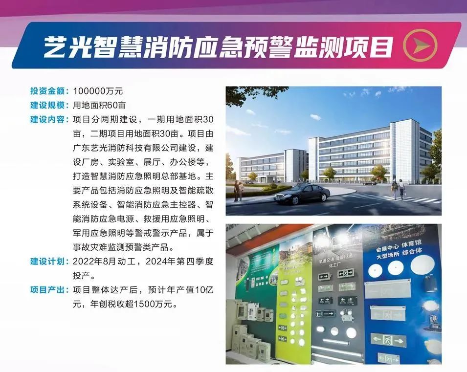 藝光智慧消防應急預警監(jiān)測項目投資金額100000萬元,建設規(guī)模60畝,分兩期建設包括廠房、實驗室、展廳、辦公樓等,將打造成智慧消防應急照明總部基地。主要產品包括消防應急照明及智能疏散系統(tǒng)設備、智能消防應急主控器、智能消防應急電源、救援用應急照明、軍用應急照明等警戒警示產品,屬于事故災難監(jiān)測預警類產品,預計2024年第四季度投產。項目整體達成后,預計年產值10億元,年創(chuàng)稅收超1500萬元。