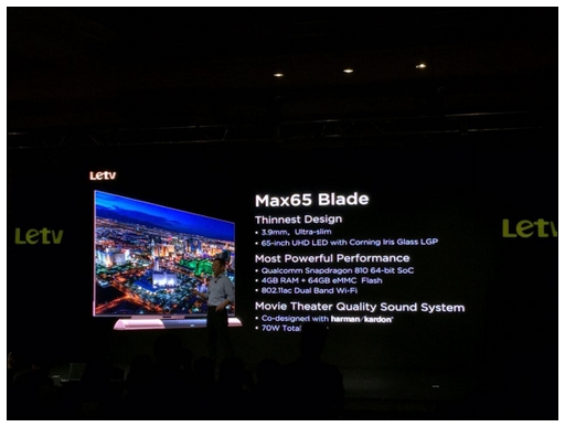 當天樂視面向全球用戶,首次公布了超級電視概念機型——第4代超級電視Max65 Blade。該產品采用分體設計,電視顯示屏厚度僅為3.9mm,是蘋果iPhone 6S厚度的一半,等同于兩枚1元硬幣厚度。這也是目前全球可以確認的最薄分體電視。