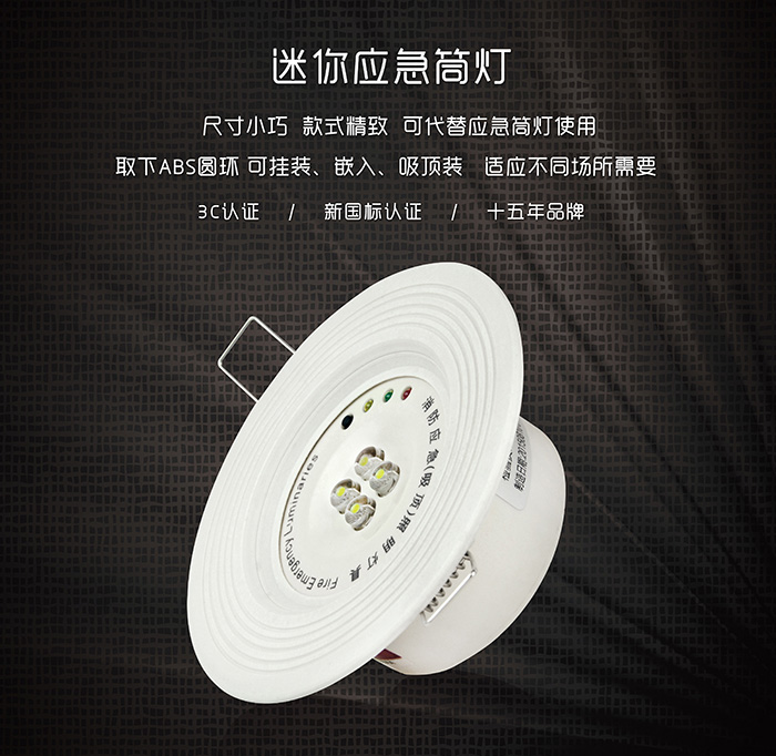 二、安裝方式靈活多樣。此款應(yīng)急筒燈在取下ABS圓環(huán)后,可掛裝、可嵌入、可吸頂安裝,多種安裝方式滿足各種場所的安裝要求。