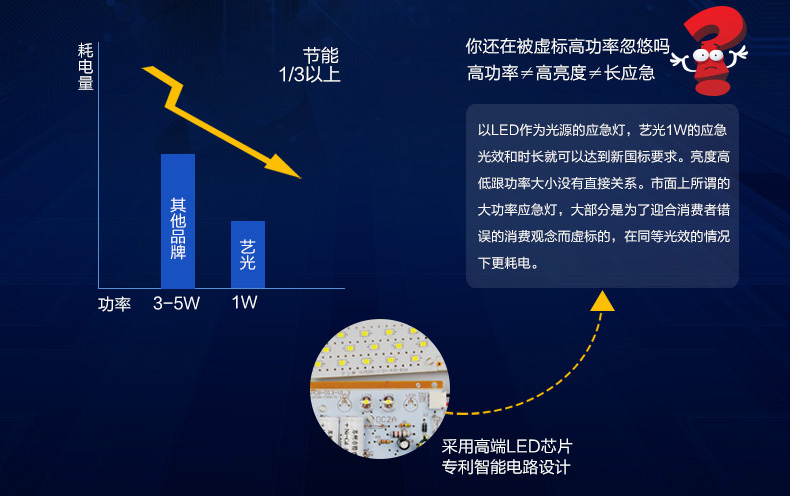 1、低功率、高亮度,更高效節(jié)能,藝光消防應(yīng)急筒燈1612只需要1W的功率,便可以達(dá)到新國標(biāo)要求,更穩(wěn)定、高效,亮度與功率沒有直接關(guān)系,這也是為什么藝光消防應(yīng)急筒燈1612只有1W的功率去可以做到高亮度發(fā)光的原因!