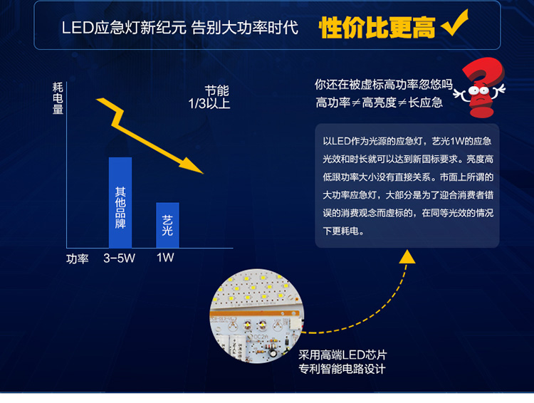 智能高效的電路設計,采用高端LED芯片,專利智能電路設計,只需要1W,應急光效與時常就可以達到新國標的要求,低功率,高亮度,更省電;