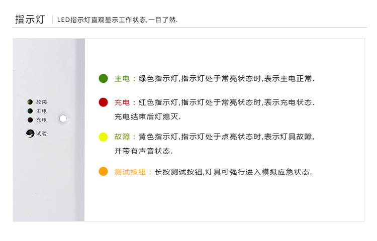 一目了然的功能指示燈,輕松知道主電、充電、故障和測試按鈕四種狀態(tài);