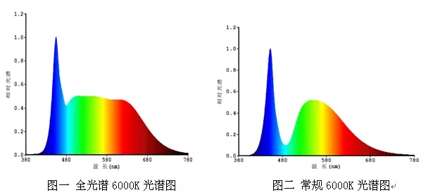 全光譜LED光源通過補全缺少的短波青光、短波綠光、長波紅光部分,大大增強是光譜連續(xù)性,增加了色域飽和度,降低了藍光比例,提升是光質(zhì)量,使得LED光源產(chǎn)品更適用于照明。全光譜LED光譜圖相對于常規(guī)LED光譜圖,藍光與光之間的缺口幾乎沒有,使得大部分藍光轉(zhuǎn)化為藍綠光,使得常規(guī)LED光源“富藍化”問題得到很好的解決,大大降低了藍光危害。此外,全光譜6000K的光譜圖連續(xù)性更好,更接近于太陽光,使得該光源更適用于室內(nèi)照明,其危害級別可以由RG2下降為RG1甚至RG0的級別。
