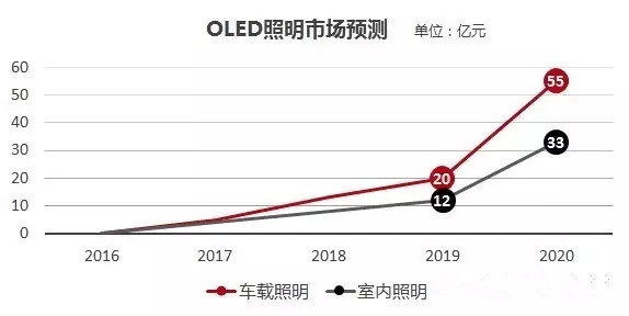 UBI 調(diào)研機(jī)構(gòu)2最新發(fā)布的 OLED 照明年度報(bào)告顯示2016年 OLED 車載照明面板的市場(chǎng)份額大約只有2000萬(wàn)元,但從2017年開(kāi)始將迅速增長(zhǎng),并超過(guò)OLED室內(nèi)照明市場(chǎng),預(yù)計(jì)到2019年OLED車載照明市場(chǎng)份額將達(dá)到20億元。