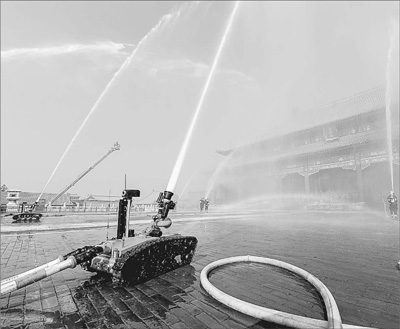 今年“10·10”故宮博物院九十一歲華誕。故宮昨日在太和殿區(qū)域進行了建院史上最大規(guī)模的消防實兵演習(xí),以此慶生,“防爆消防滅火偵查機器人”也因此首次在故宮“滅火”。