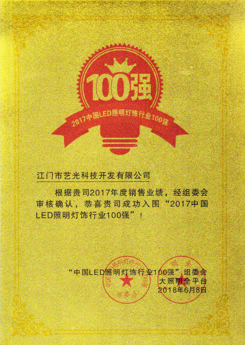 重磅發(fā)布丨藝光集團入圍“2017年中國LED照明燈飾行業(yè)100強”
